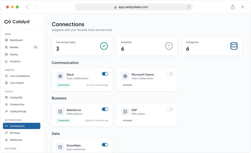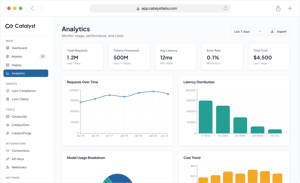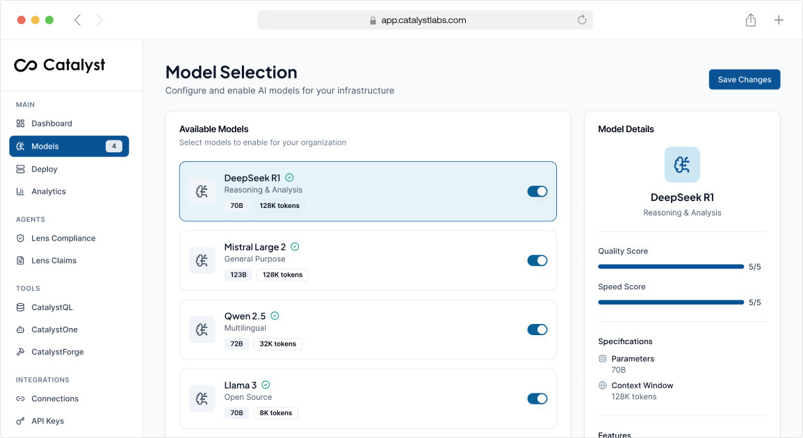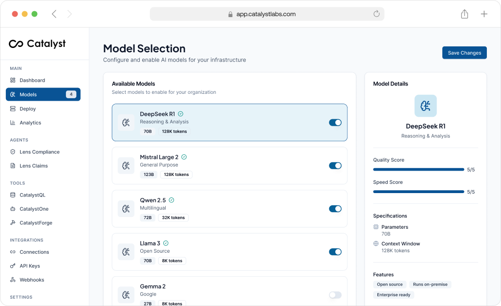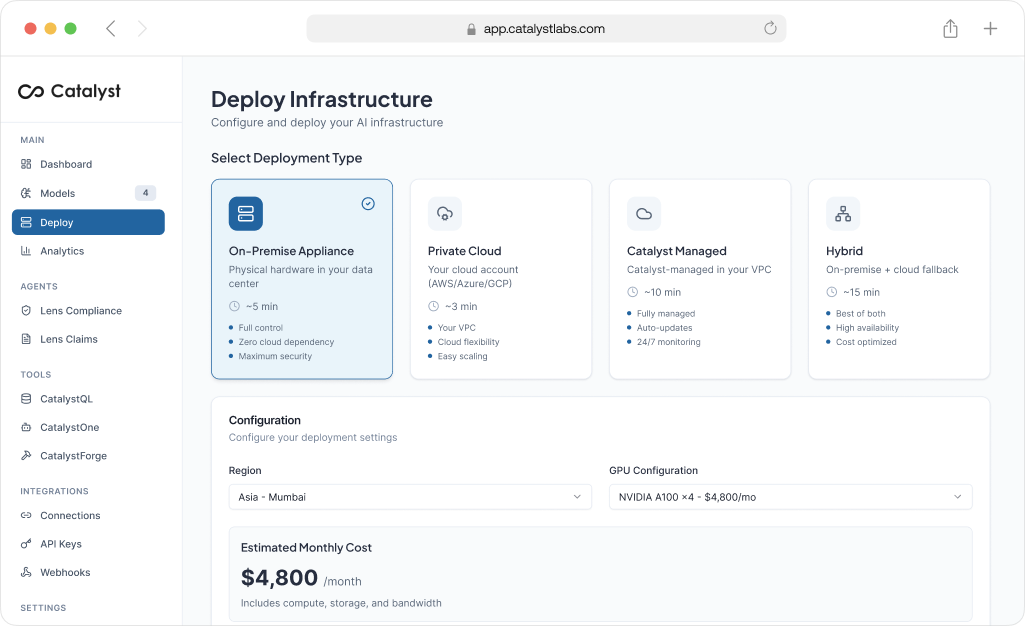 Absolutely. We built the Catalyst Platform with a "Your Data, Your Rules" philosophy. Unlike many Gen AI startups that force you into a public cloud, our platform allows you to deploy any of our models—from Lens Compliance to Catalyst QL—on-premises or within your private cloud. You keep total sovereignty over your data; we just provide the intelligence.