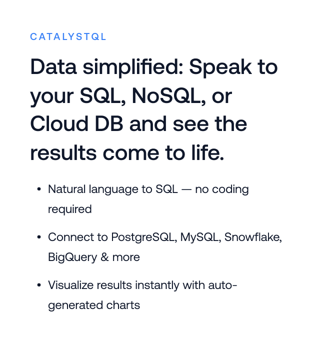 Not a single line. Catalyst QL is an NL2SQL (Natural Language to SQL) platform. You ask a question in plain English—like "What was our loan default rate in the Northeast last quarter?"—and Catalyst QL writes the code, queries your databases, and visualizes the answer. It’s like giving your data a voice.