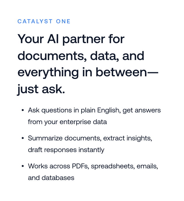 It won't just replace it; it will supercharge it. Catalyst One allows your team to "talk" to thousands of pages of documents or complex databases simultaneously. Whether you're looking for a specific clause in a 500-page contract or summarizing an entire year of claims history, Catalyst One provides cited, accurate answers in seconds.
