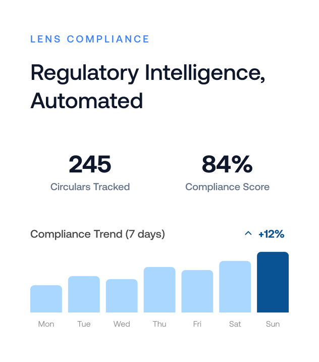 Lens Compliance isn't just a static database; it’s a living monitor. It ingest new circulars and regulatory updates in real-time, automatically mapping them against your existing data and audit logs. It doesn't just tell you the law changed—it tells you exactly which parts of your business are now at risk.